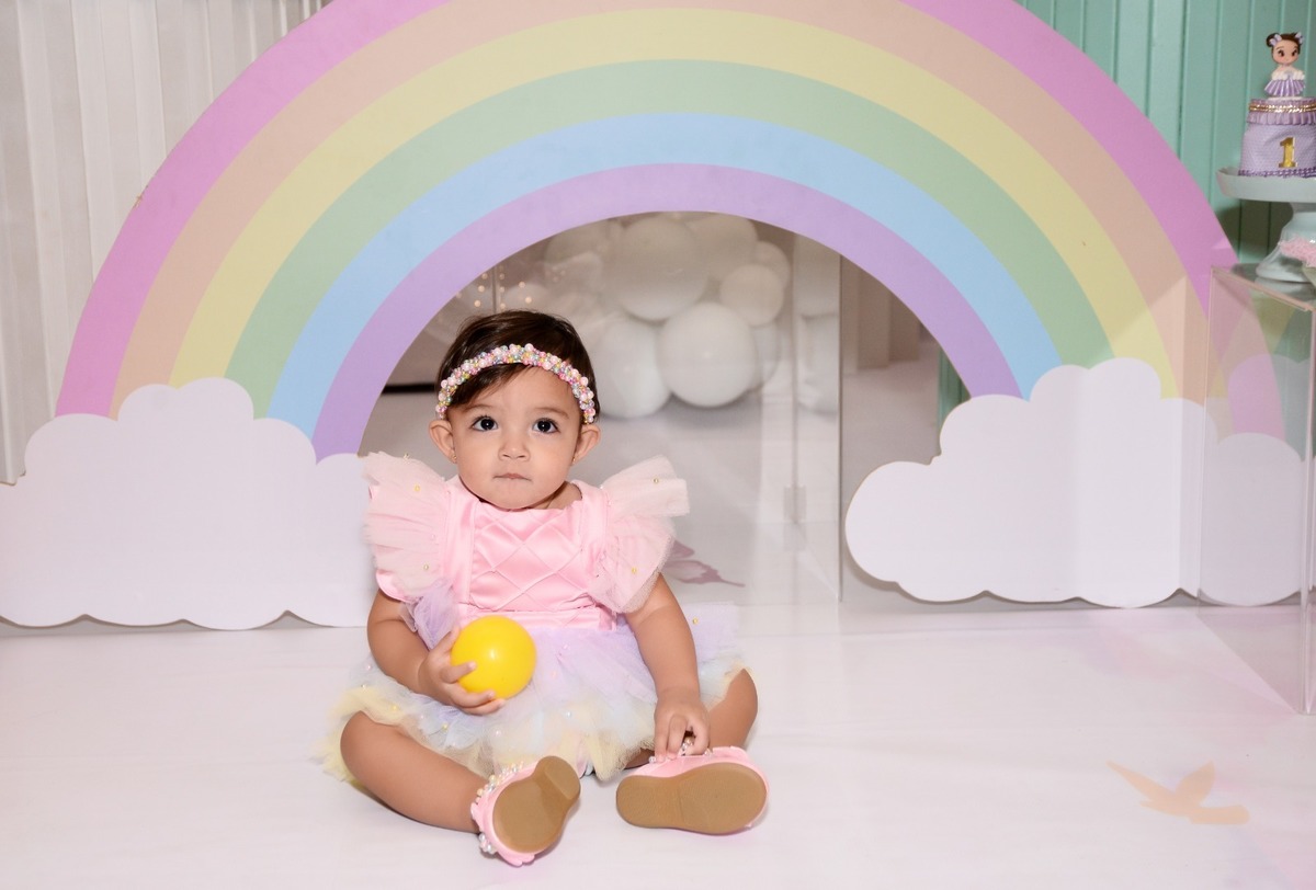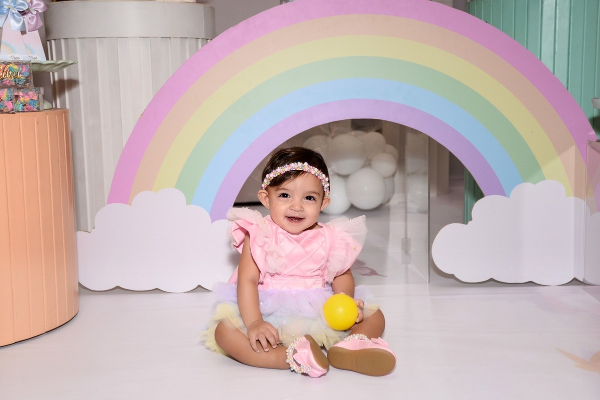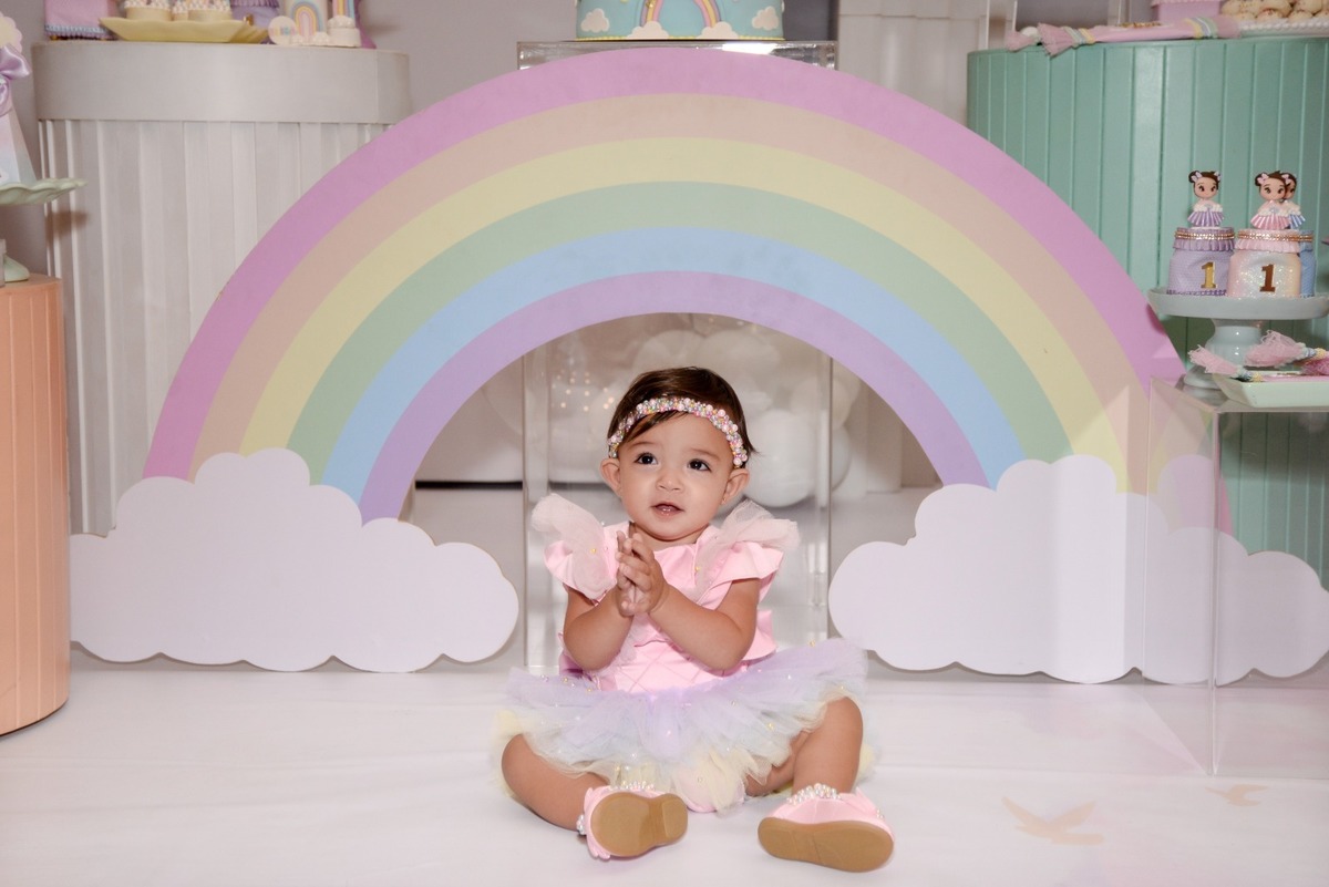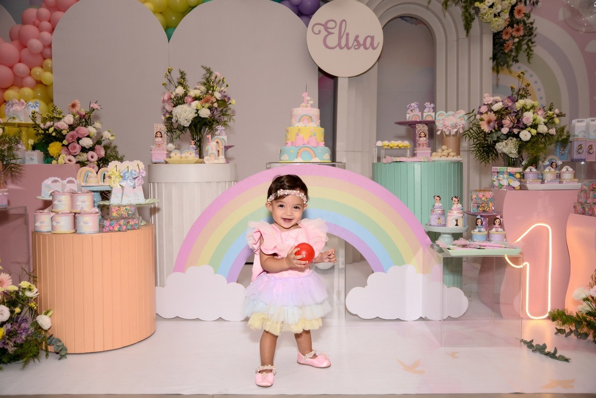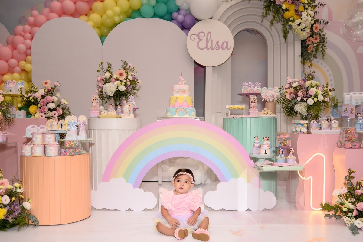 Que a felicidade e o amor continuem brilhando como esse arco-íris que representa a doçura e a magia que ela nos traz todos os dias. 💖 #PrimeiroAninho #ElisaArcoÍris #AmorSemFim"