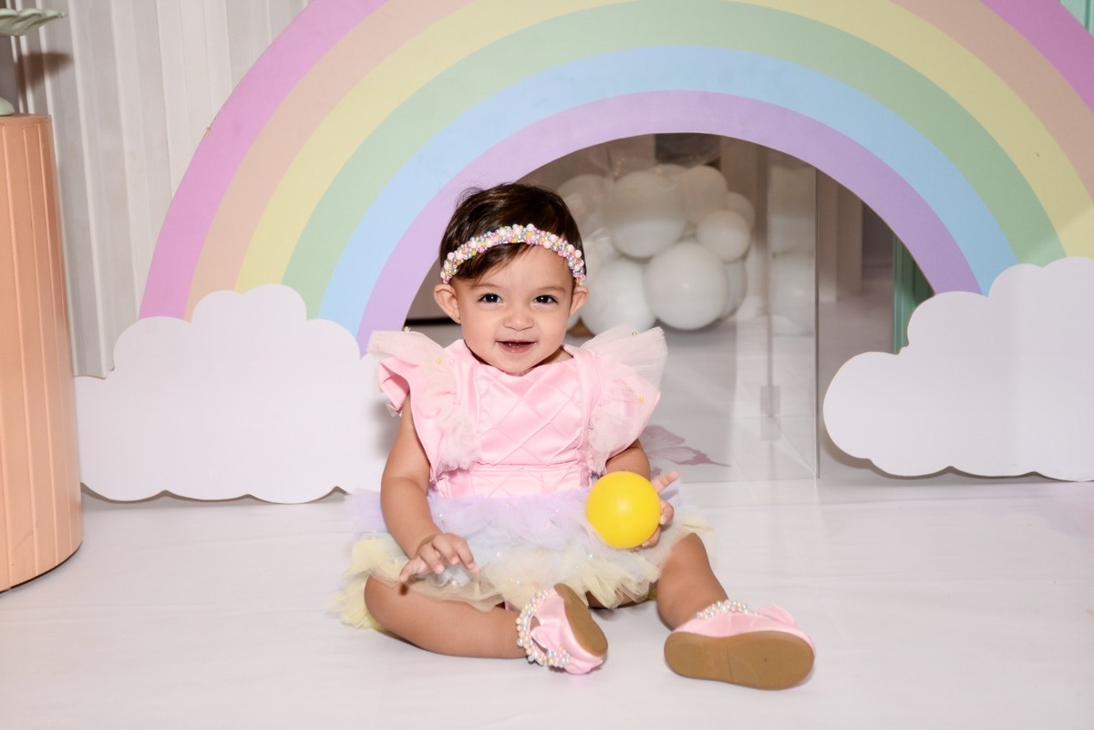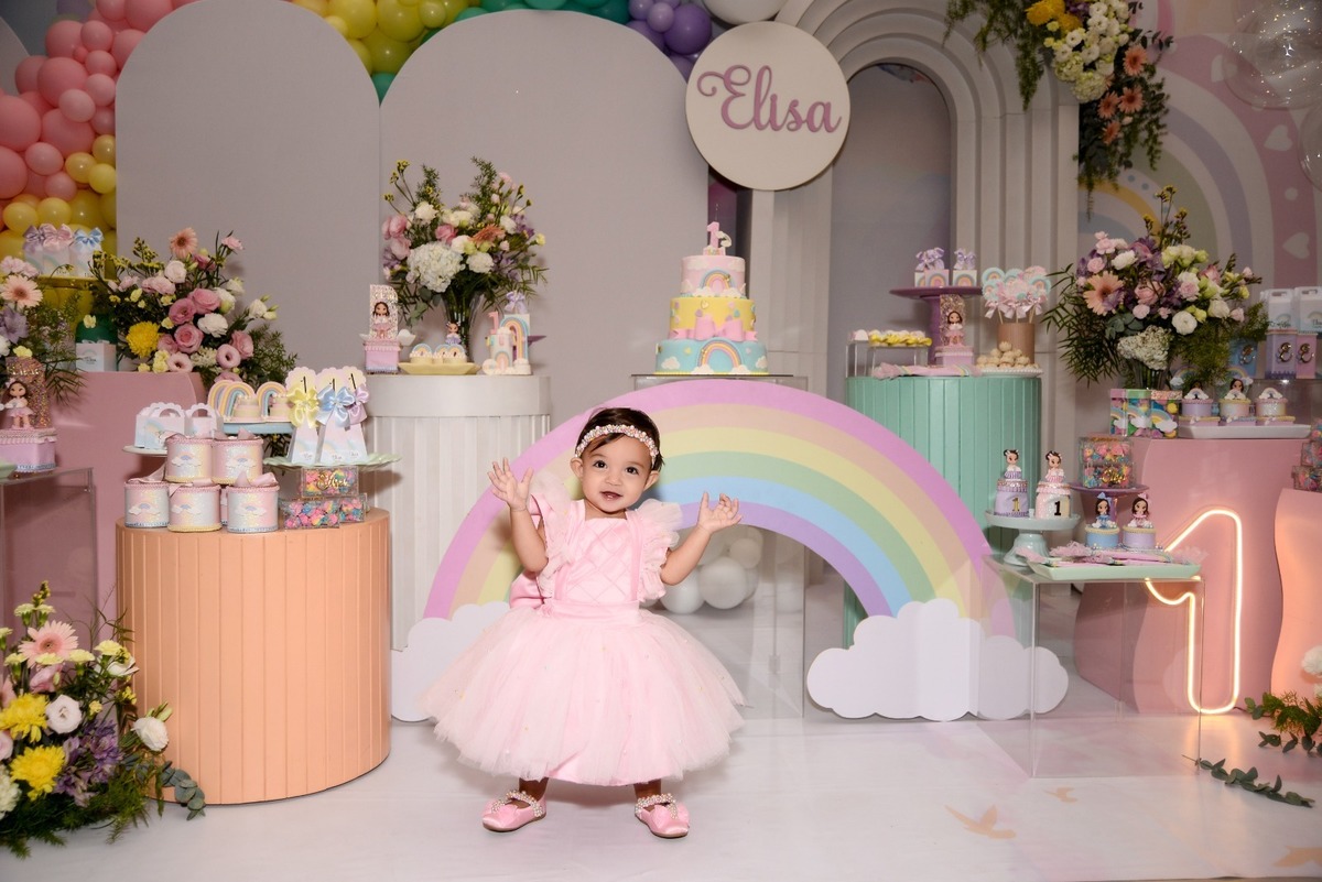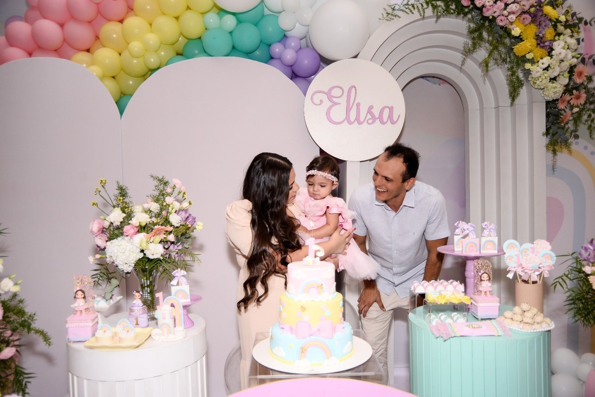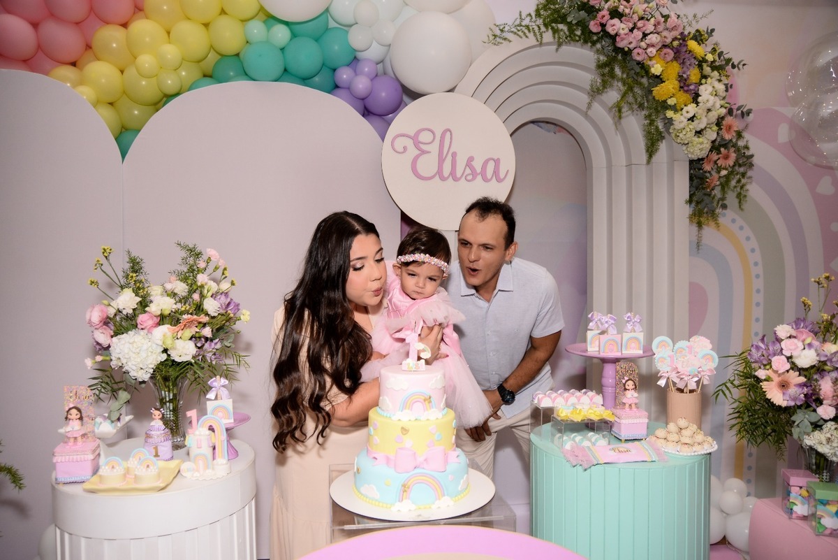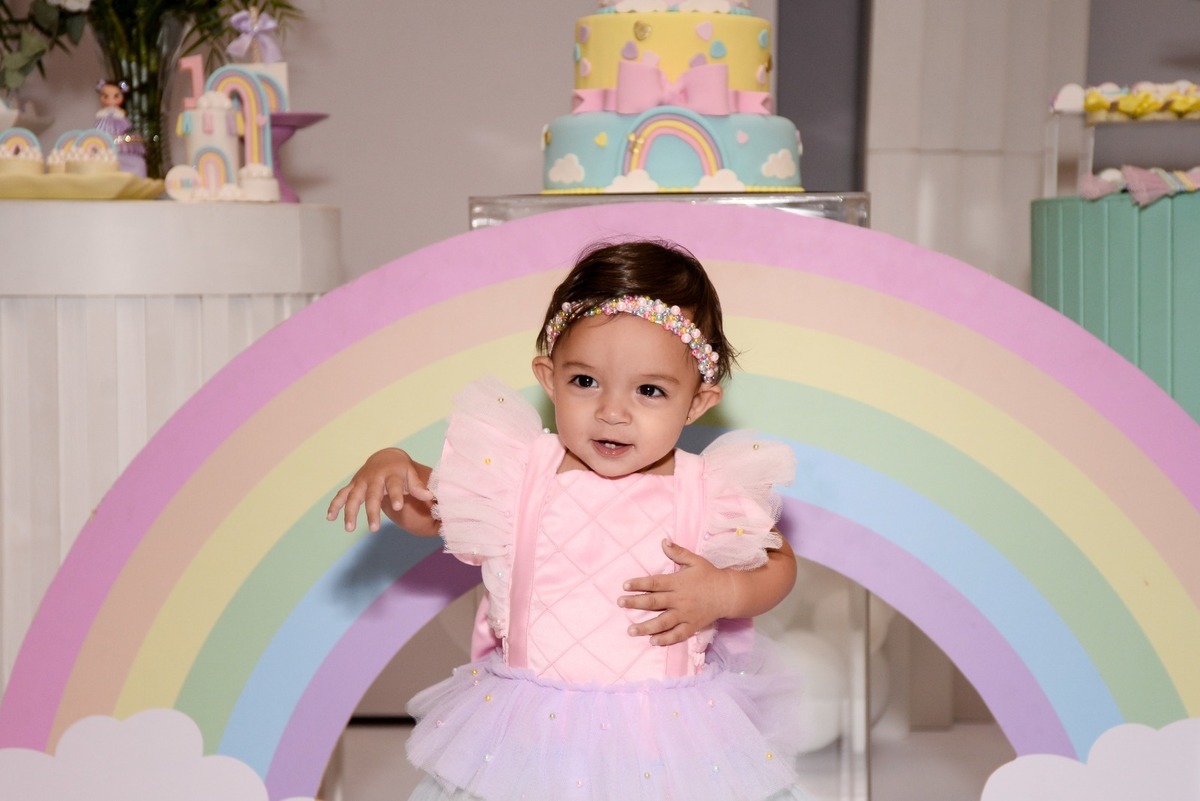 Que a felicidade e o amor continuem brilhando como esse arco-íris que representa a doçura e a magia que ela nos traz todos os dias. 💖 #PrimeiroAninho #ElisaArcoÍris #AmorSemFim"