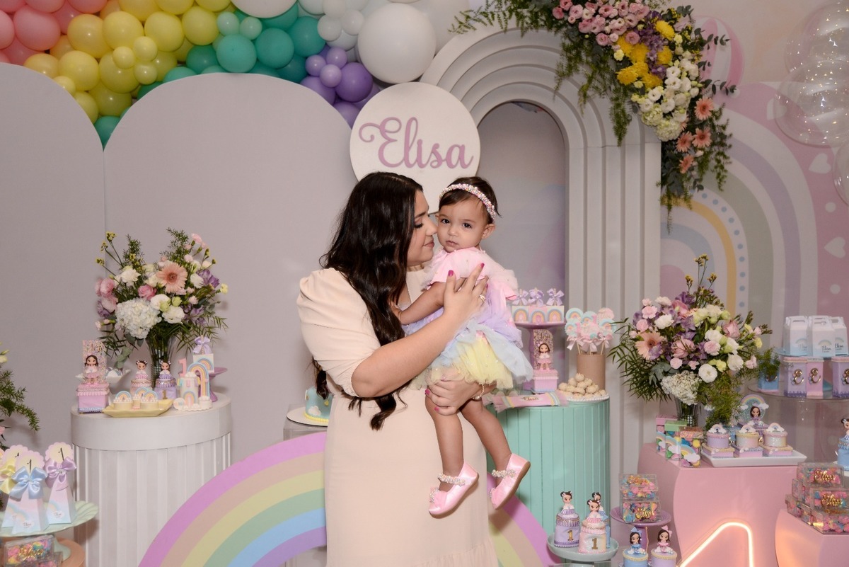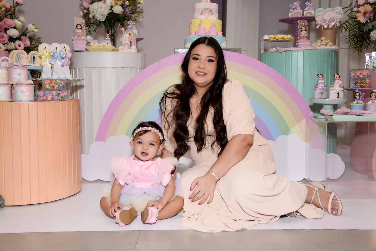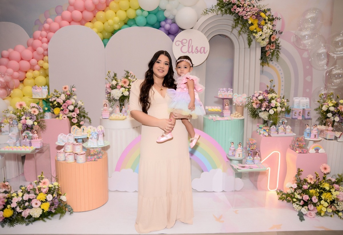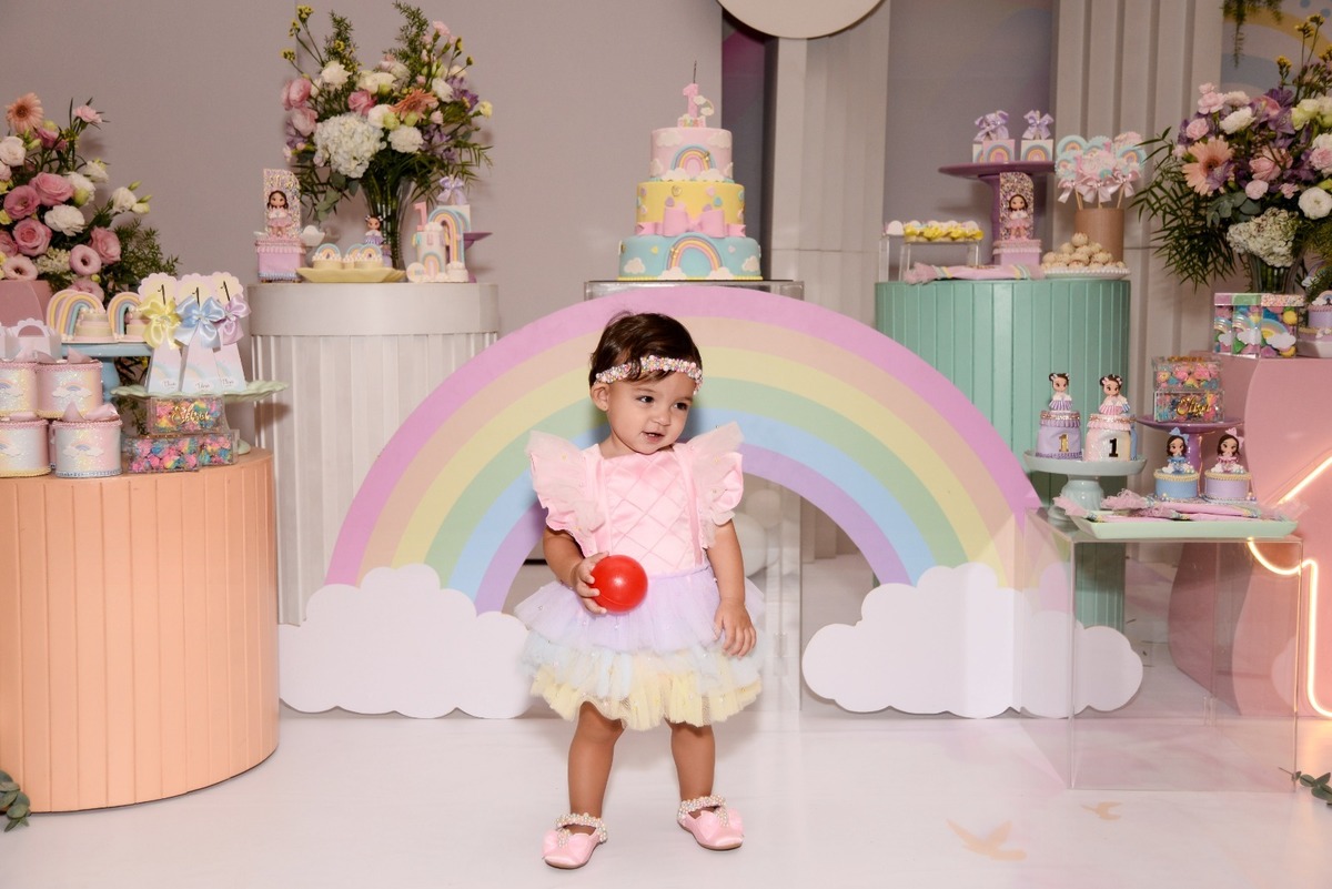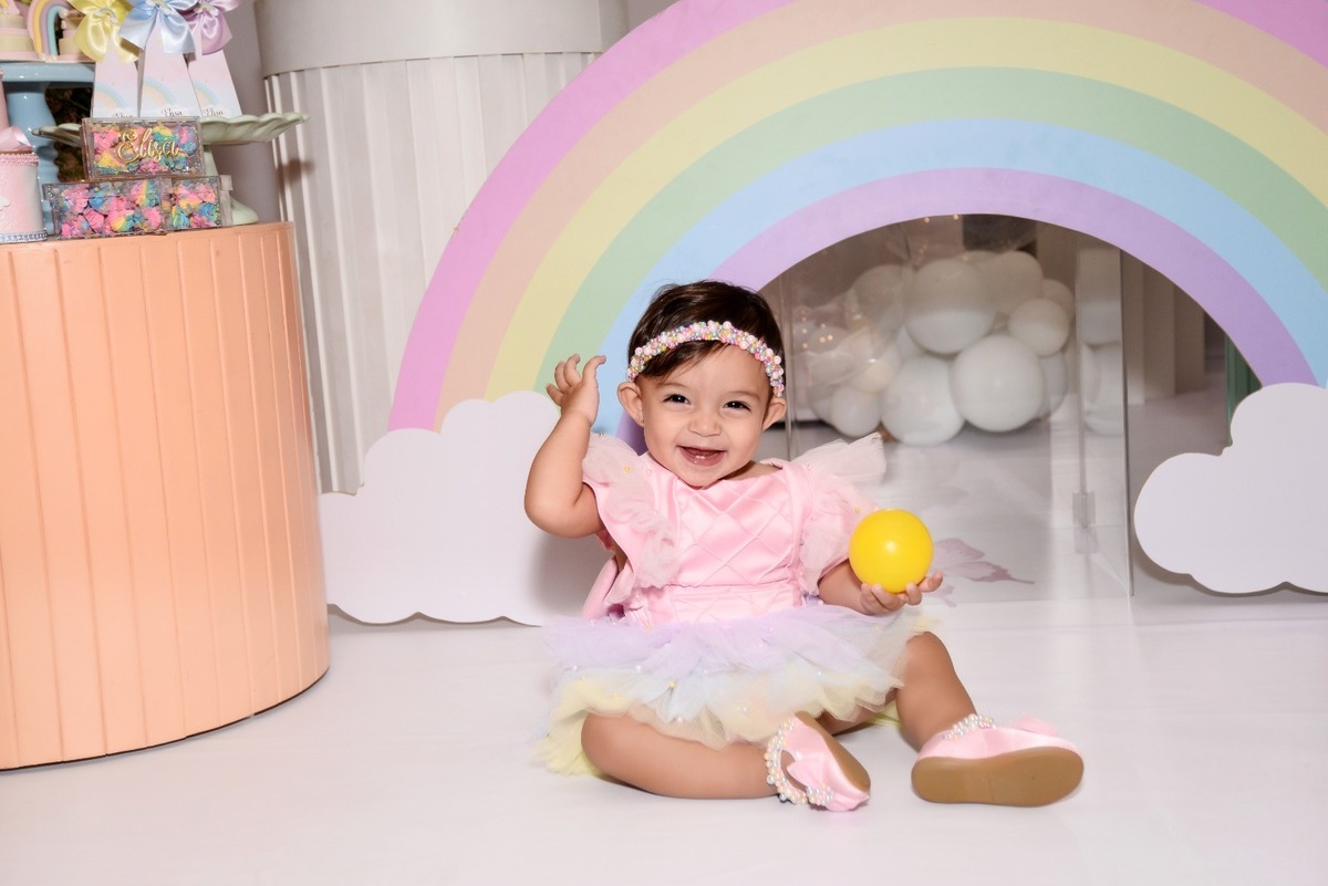 Que a felicidade e o amor continuem brilhando como esse arco-íris que representa a doçura e a magia que ela nos traz todos os dias. 💖 #PrimeiroAninho #ElisaArcoÍris #AmorSemFim"