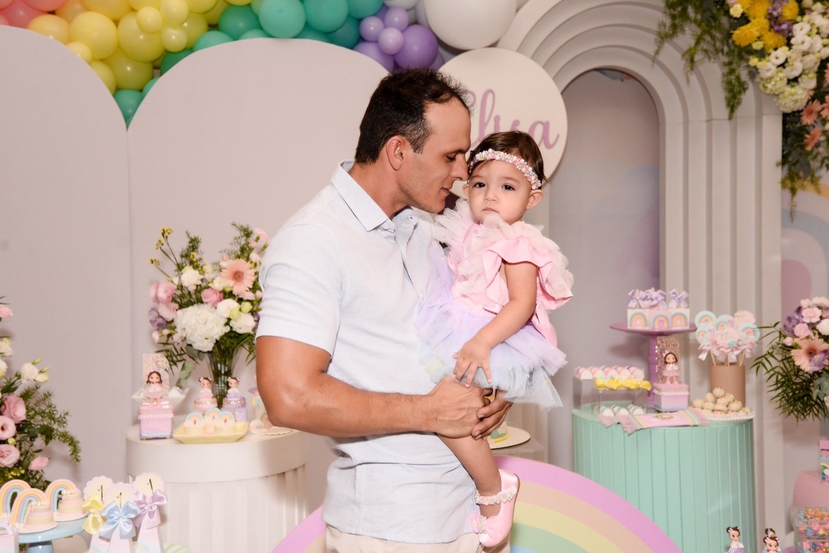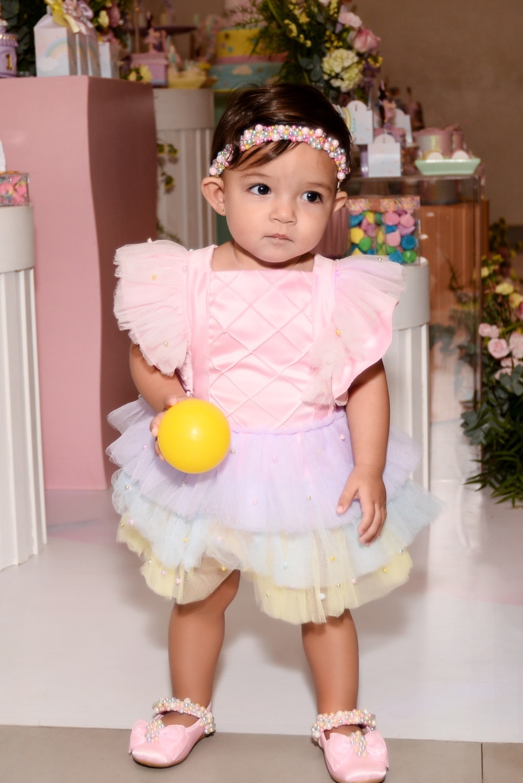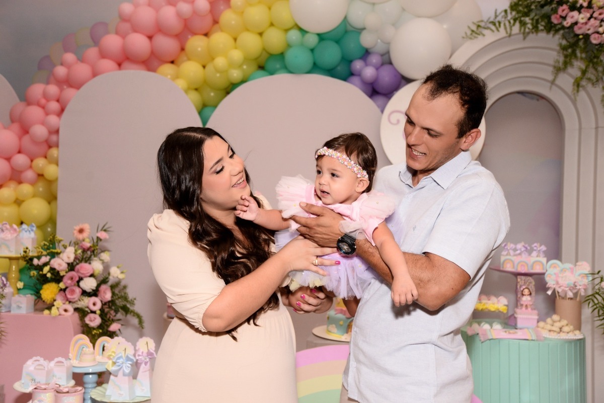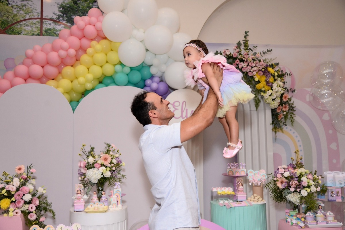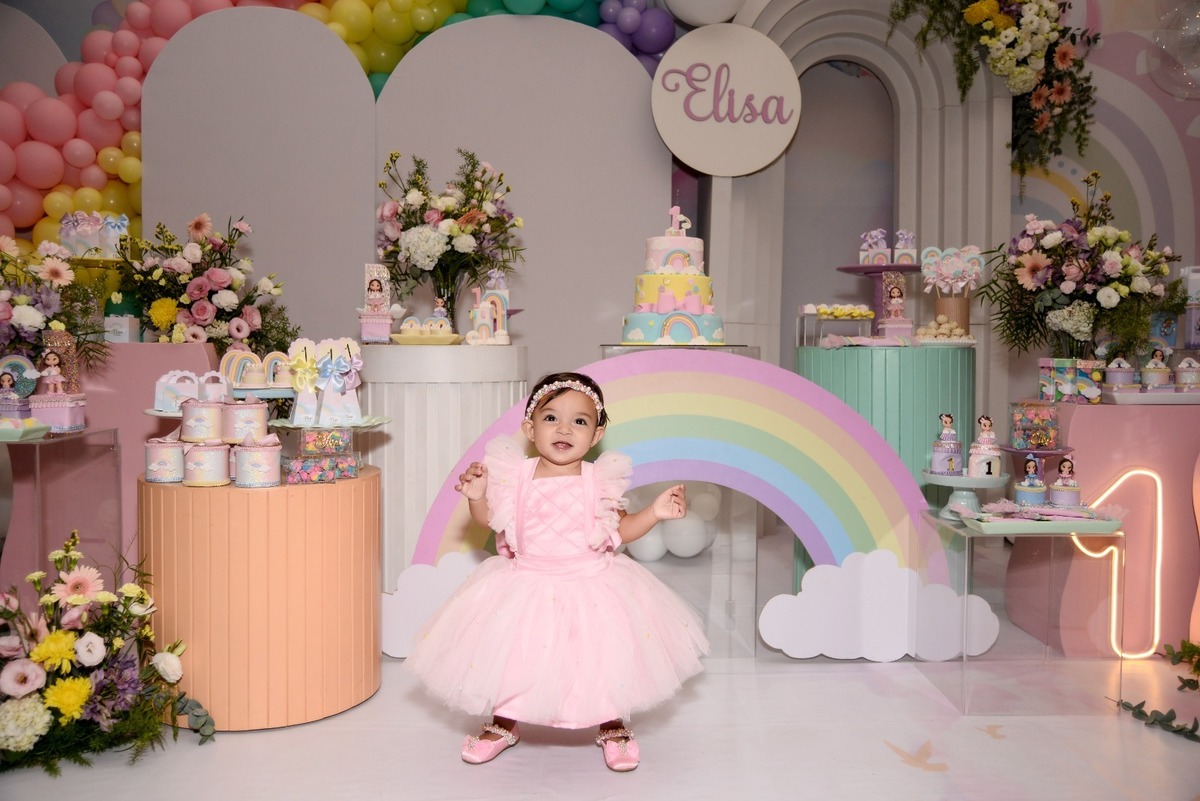 Que a felicidade e o amor continuem brilhando como esse arco-íris que representa a doçura e a magia que ela nos traz todos os dias. 💖 #PrimeiroAninho #ElisaArcoÍris #AmorSemFim"