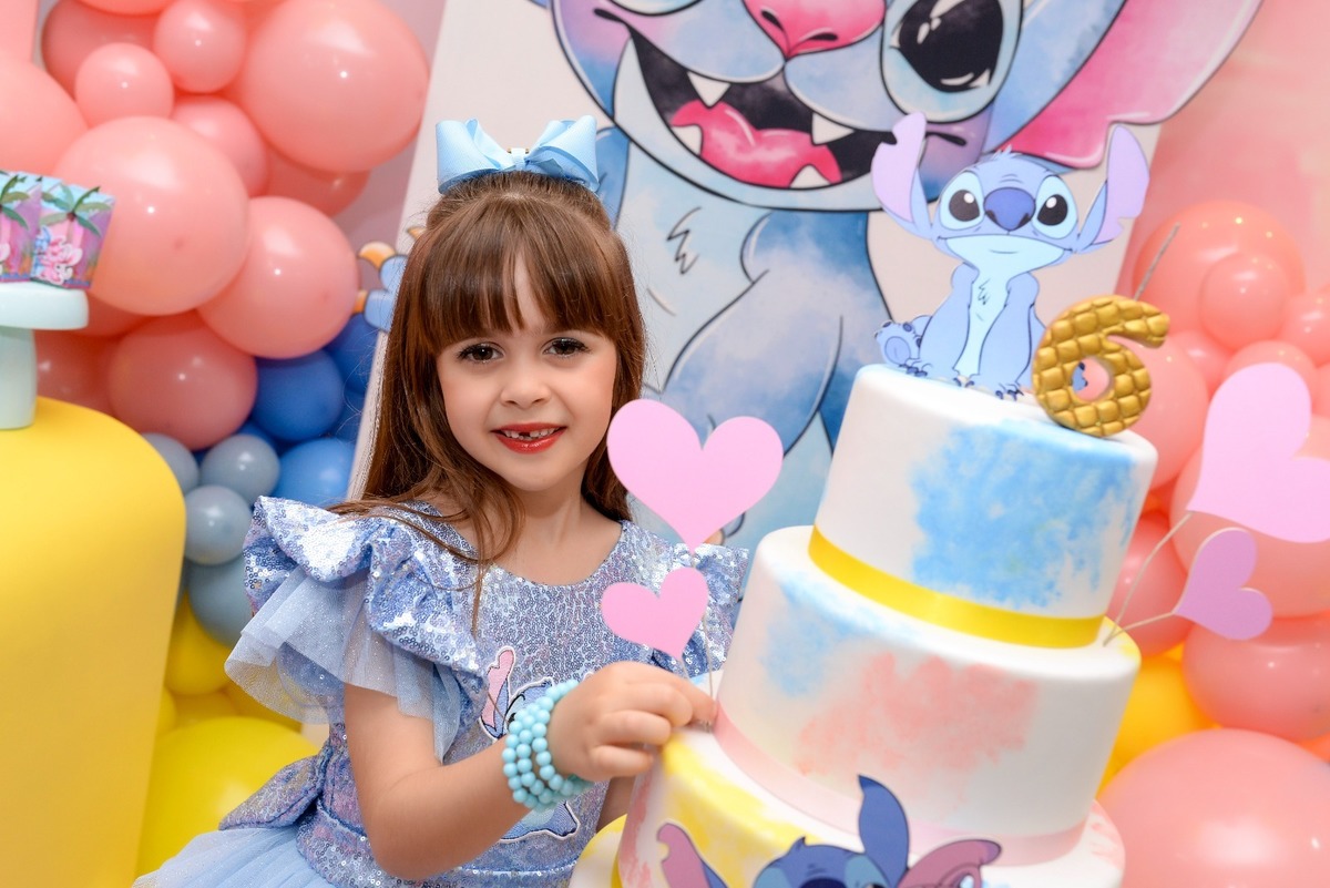 Luísa comemorando seus 6 anos em uma festa encantada no universo do Stitch! Uma aventura cheia de cor, alegria e muito carinho.