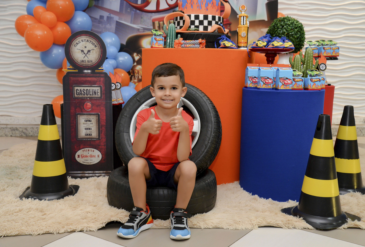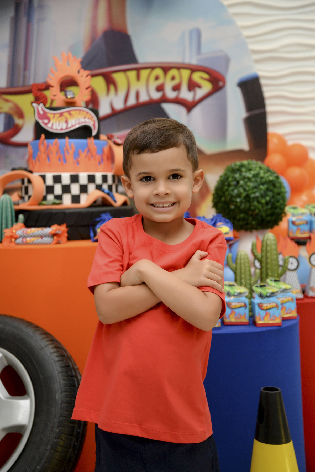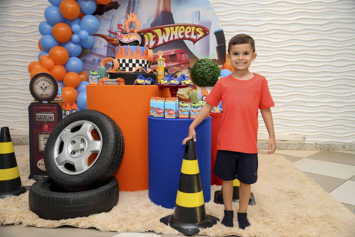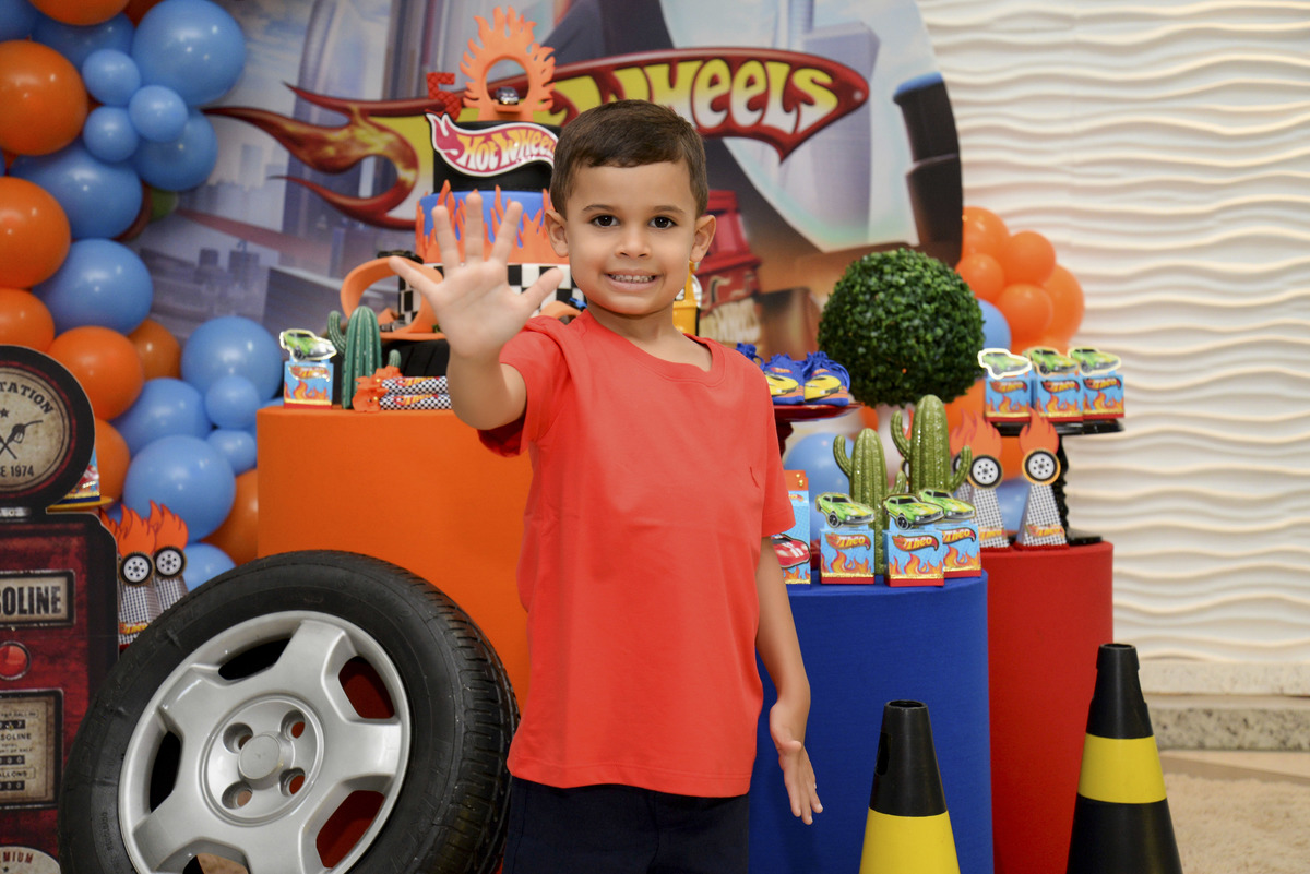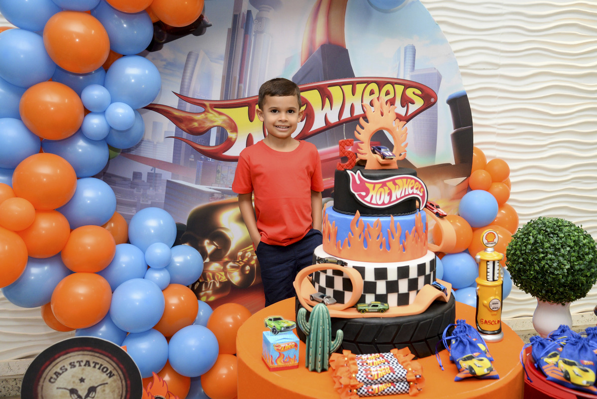 Théo celebra 5 anos em uma corrida de diversão, cores e emoção Hot Wheels.